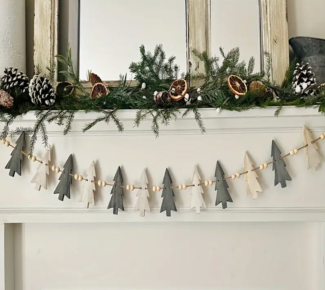 Guirnalda con 12 pinos de madera tonos verde y neutro.